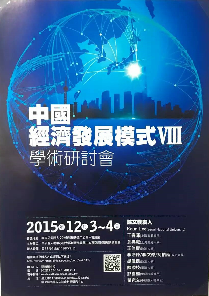 2015年12月2日至2015年12月6日,由台湾中研院人文社会科学研究中心主办的“中国经济发展模式Ⅷ”学术研讨会顺利举行。中国产业发展研究院院长干春晖、院长助理余典范应邀赴台出席本次学术研讨会,与来自韩国首尔大学、台湾大学台湾、政治大学、台湾淡江大学、台湾中研院等学术机构的专家学者共计60多人进行了纯学术交流。本次学术研讨会的议题包括中国经济转型与产业升级、具有中国特色的产业政策等。