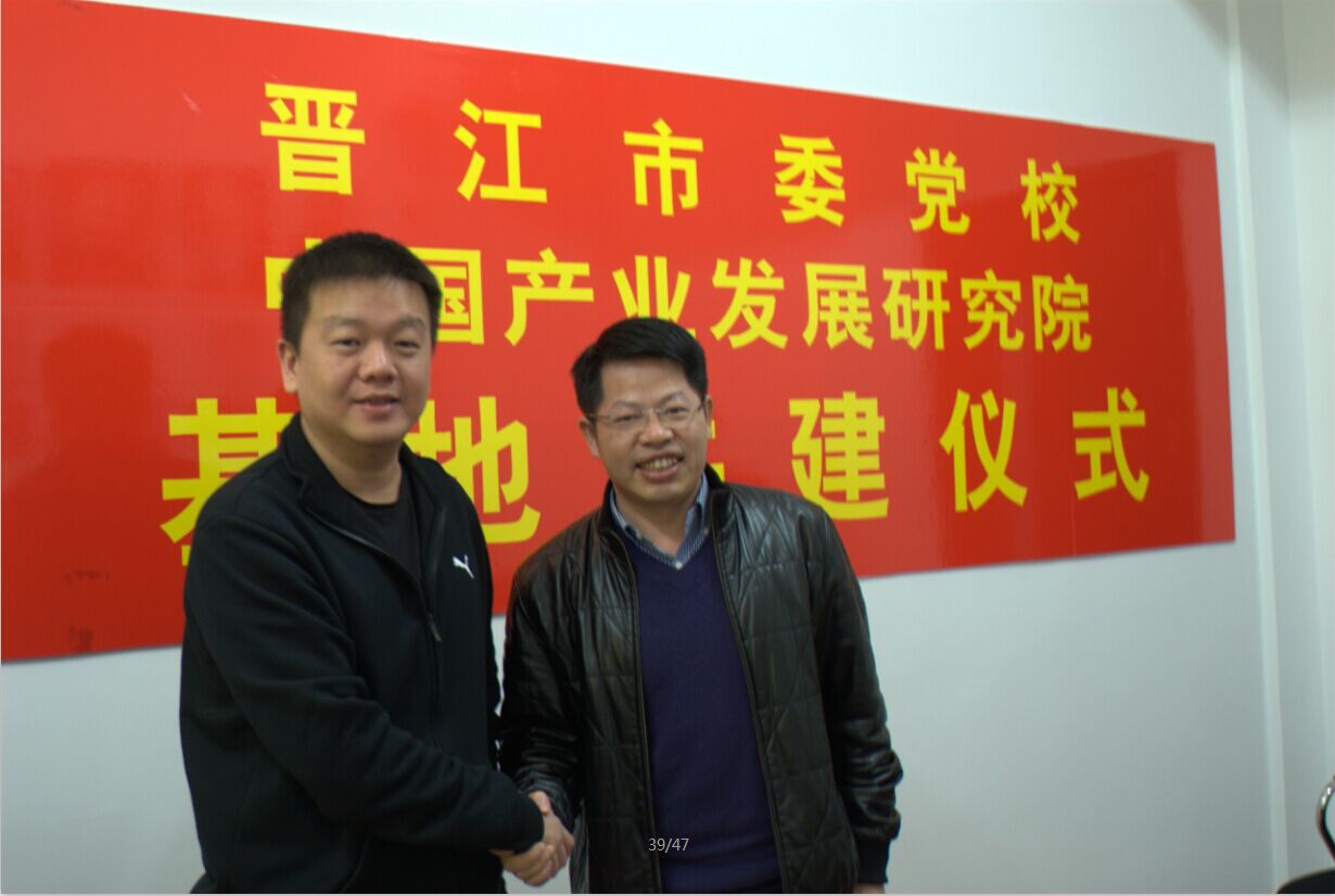 在签定协议的仪式上,研究院副院长刘志阳教授详细地向晋江党校领导一行人介绍了我院的科研工作成果和未来发展计划。仪式最后双方领导在达成共识的前提下,签订了基地共建协议、建立起长期战略合作伙伴关系。