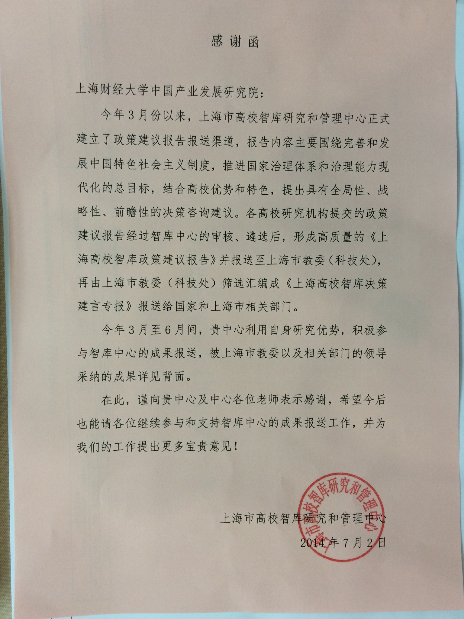 7月2日,上海市高校智库研究和管理中心就此向我院发来感谢函,对我院所作的决策咨询工作表示感谢。感谢函称,自今年3月上海高校智库研究和管理中心编辑《上海高校智库政策建议报告》以来,我院利用自身研究优势,积极参与智库中心的成果报送,并且部分要报已被上海市教委及相关部门采纳,希望今后与我院更加“精诚合作、携手并进”。